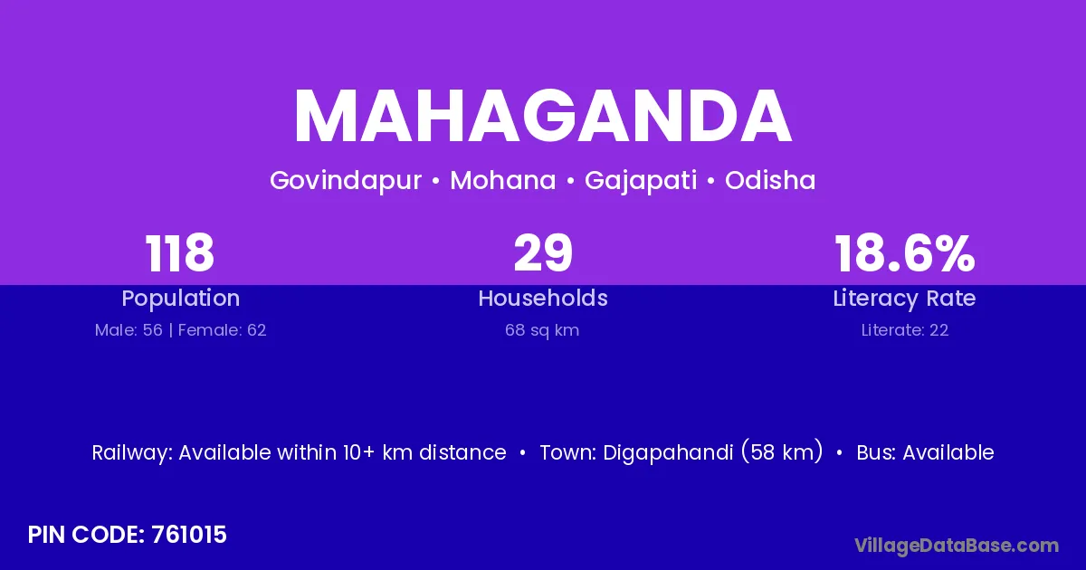 Digapahandi (58 km) is the nearest town to Mahaganda village for major economic activities and is located approximately 58 km away.