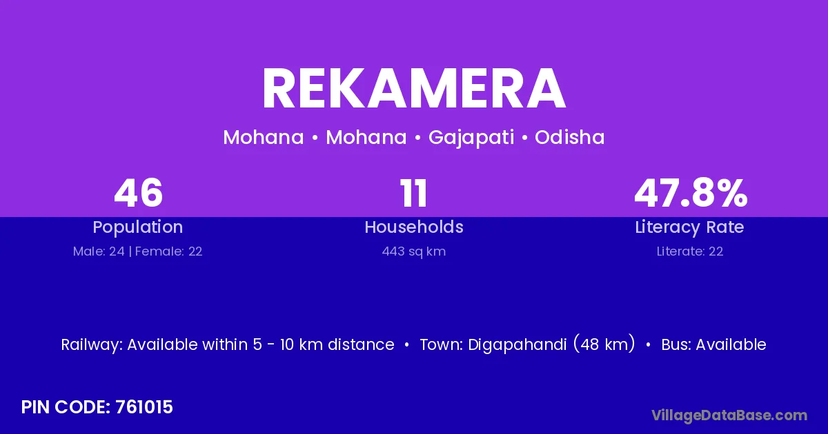 Digapahandi (48 km) is the nearest town to Rekamera village for major economic activities and is located approximately 48 km away.