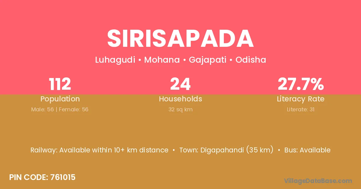 Sirisapada village has a total population of 112 people, of which 56 are males and 56 are females.
