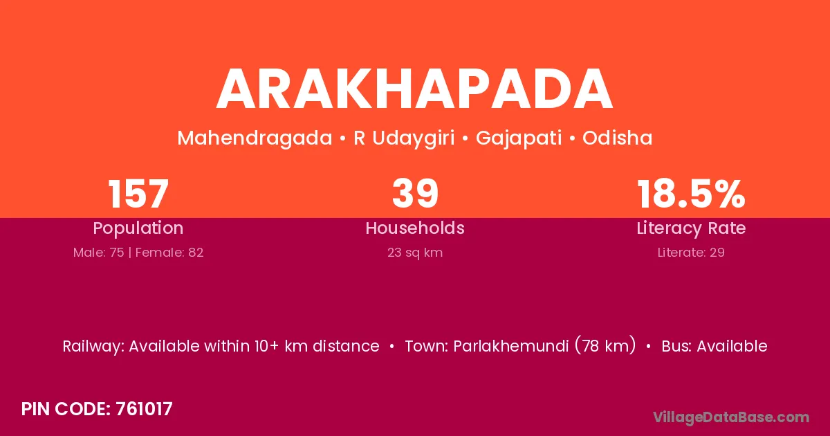 Parlakhemundi (78 km) is the nearest town to Arakhapada village for major economic activities and is located approximately 78 km away.
