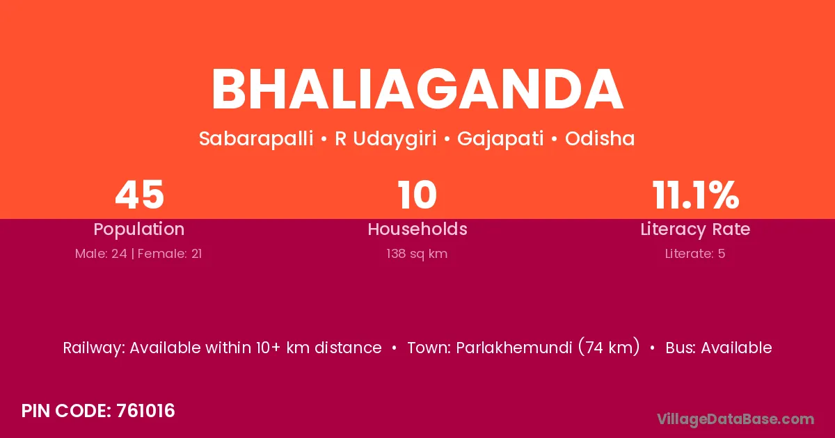 Parlakhemundi (74 km) is the nearest town to Bhaliaganda village for major economic activities and is located approximately 74 km away.