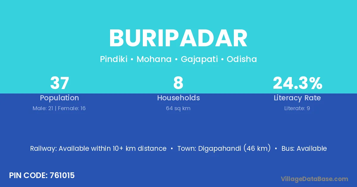 Parlakhemundi (84 km) is the nearest town to Buripadar village for major economic activities and is located approximately 84 km away.