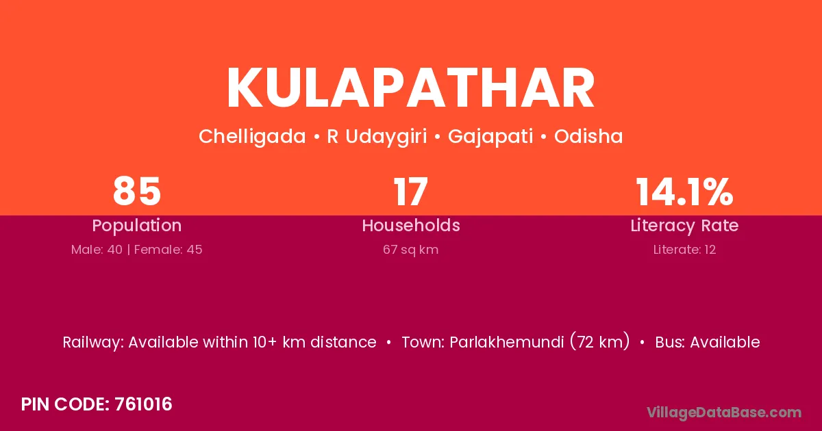 Parlakhemundi (72 km) is the nearest town to Kulapathar village for major economic activities and is located approximately 72 km away.