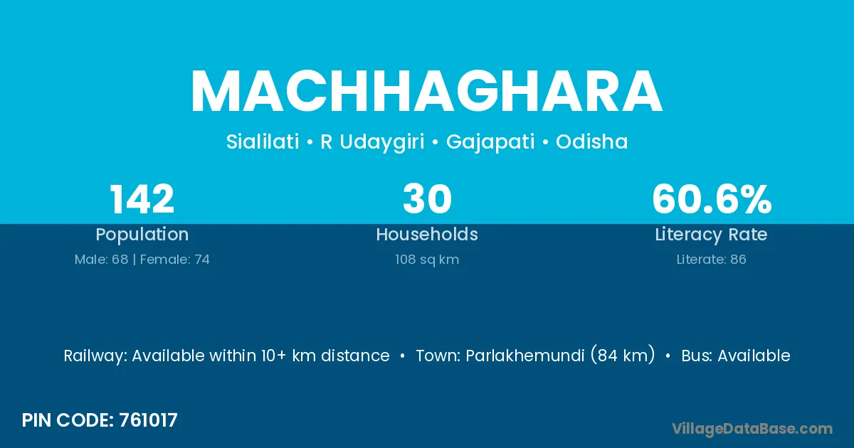 Parlakhemundi (84 km) is the nearest town to Machhaghara village for major economic activities and is located approximately 84 km away.