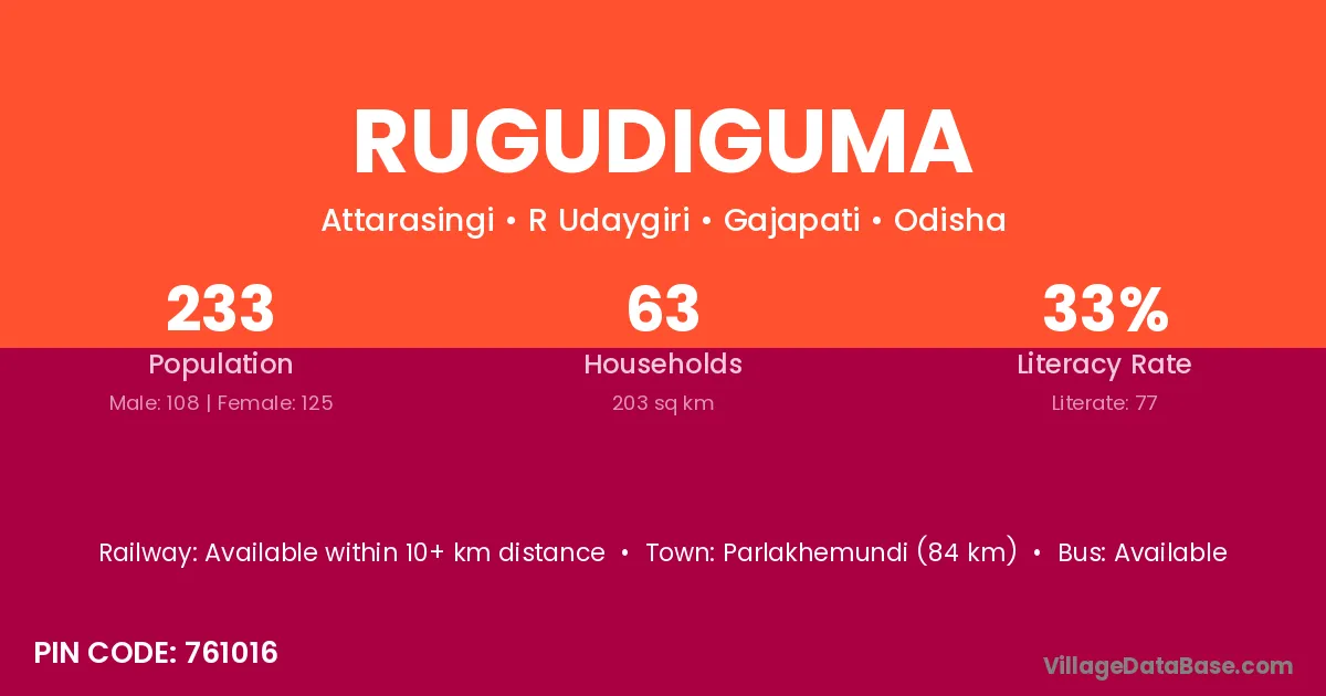 Parlakhemundi (84 km) is the nearest town to Rugudiguma village for major economic activities and is located approximately 84 km away.