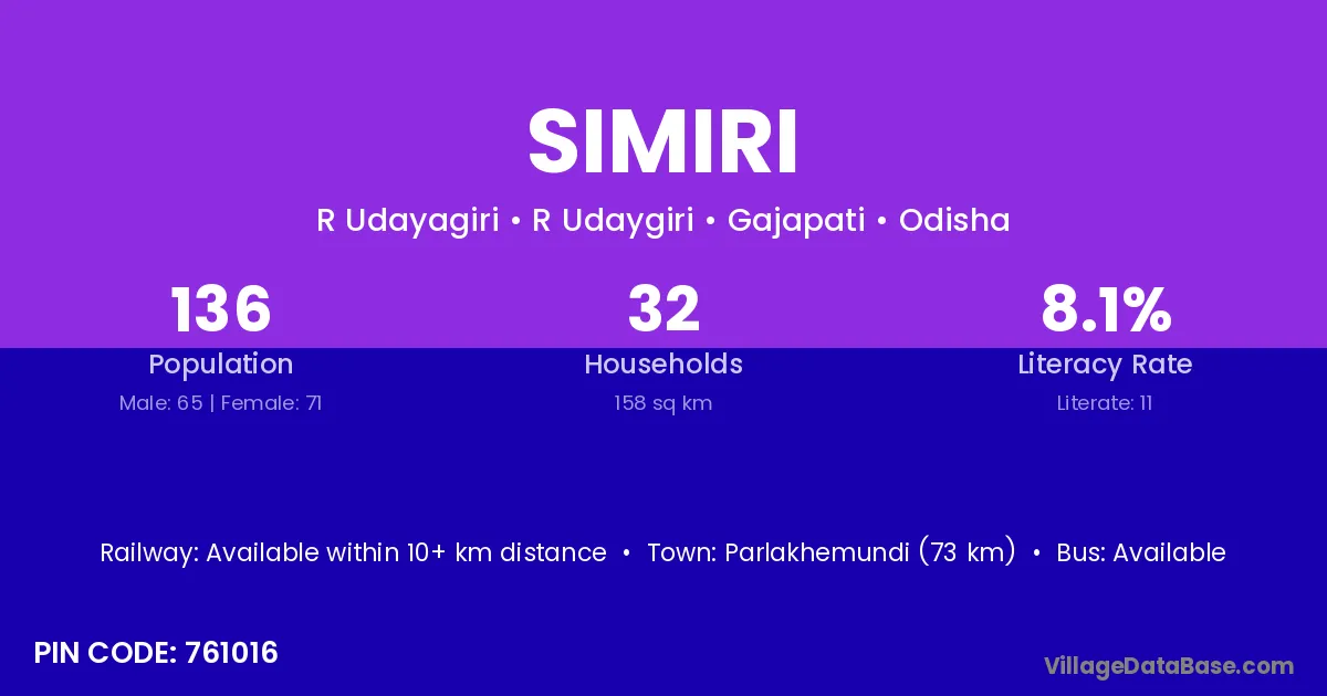 Parlakhemundi (73 km) is the nearest town to Simiri village for major economic activities and is located approximately 73 km away.