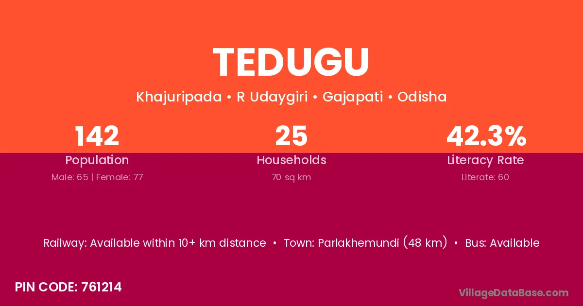 Parlakhemundi (48 km) is the nearest town to Tedugu village for major economic activities and is located approximately 48 km away.