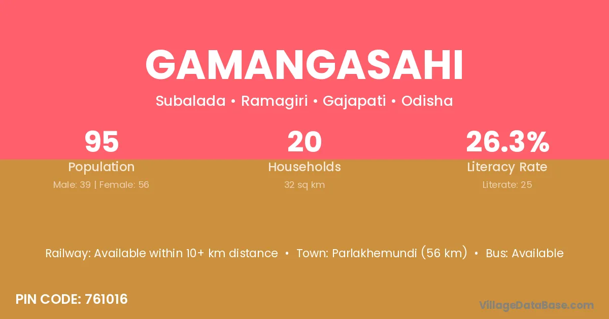 Parlakhemundi (56 km) is the nearest town to Gamangasahi village for major economic activities and is located approximately 56 km away.