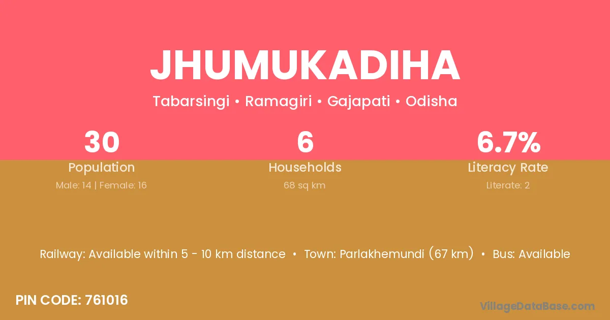 Parlakhemundi (67 km) is the nearest town to Jhumukadiha village for major economic activities and is located approximately 67 km away.