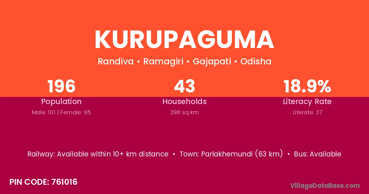 Parlakhemundi (63 km) is the nearest town to Kurupaguma village for major economic activities and is located approximately 63 km away.