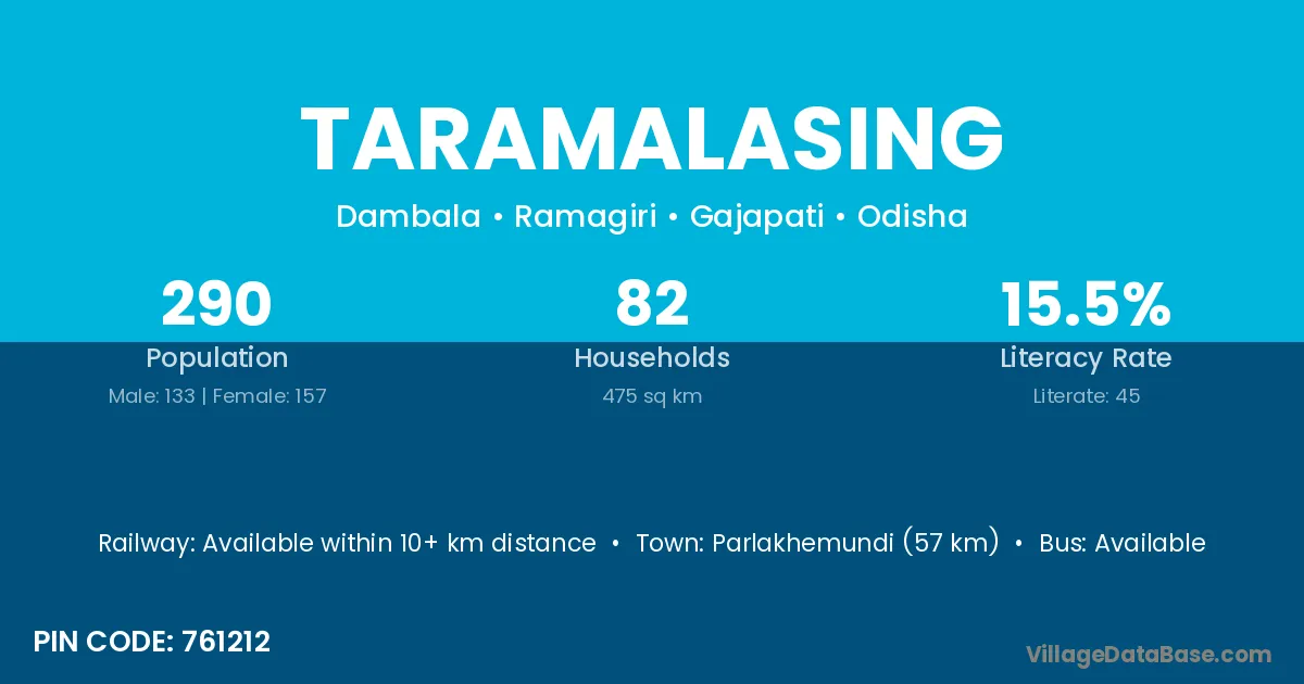 Parlakhemundi (57 km) is the nearest town to Taramalasing village for major economic activities and is located approximately 57 km away.