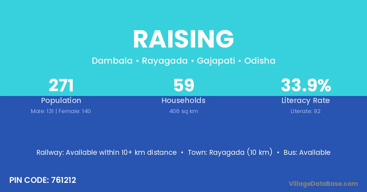Rayagada (10 km) is the nearest town to Raising village for major economic activities and is located approximately 10 km away.