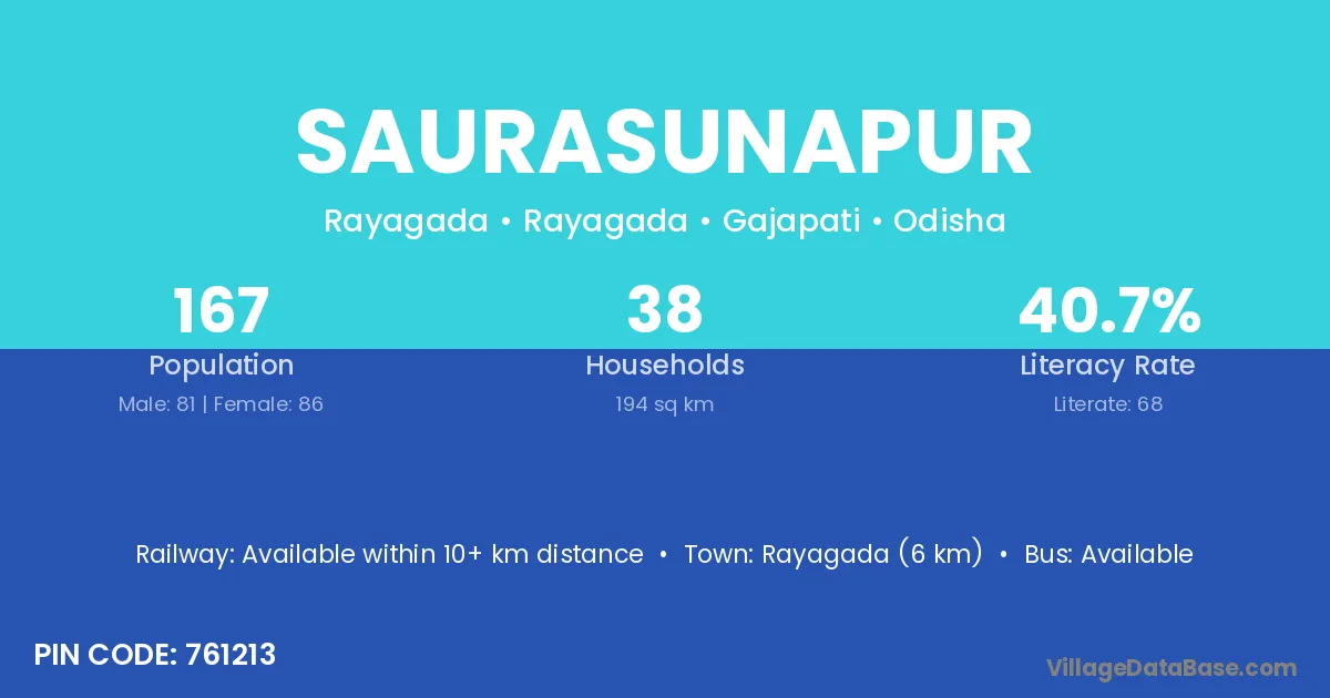 Rayagada (6 km) is the nearest town to Saurasunapur village for major economic activities and is located approximately 6 km away.