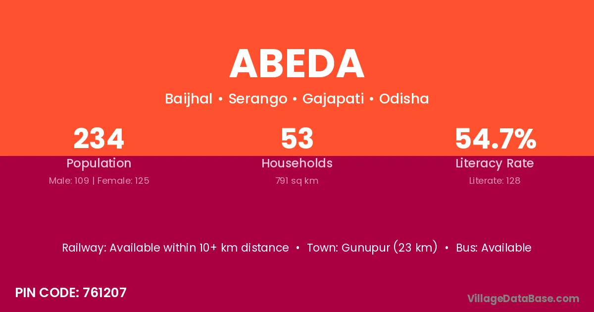 Gunupur (23 km) is the nearest town to Abeda village for major economic activities and is located approximately 23 km away.