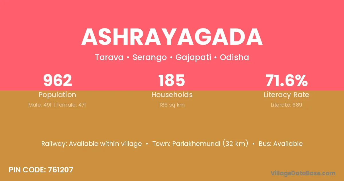 Ashrayagada village has a total population of 962 people, of which 491 are males and 471 are females.