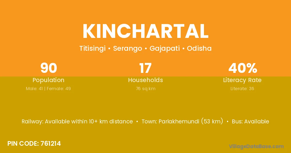 Parlakhemundi (53 km) is the nearest town to Kinchartal village for major economic activities and is located approximately 53 km away.