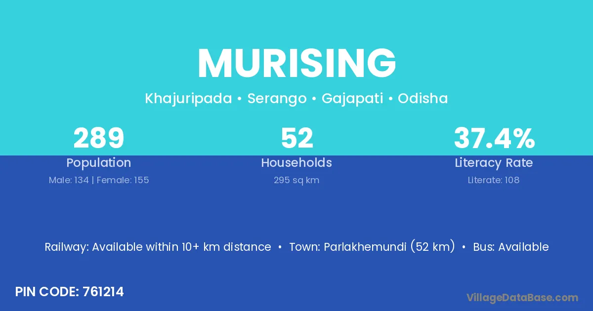 Parlakhemundi (52 km) is the nearest town to Murising village for major economic activities and is located approximately 52 km away.