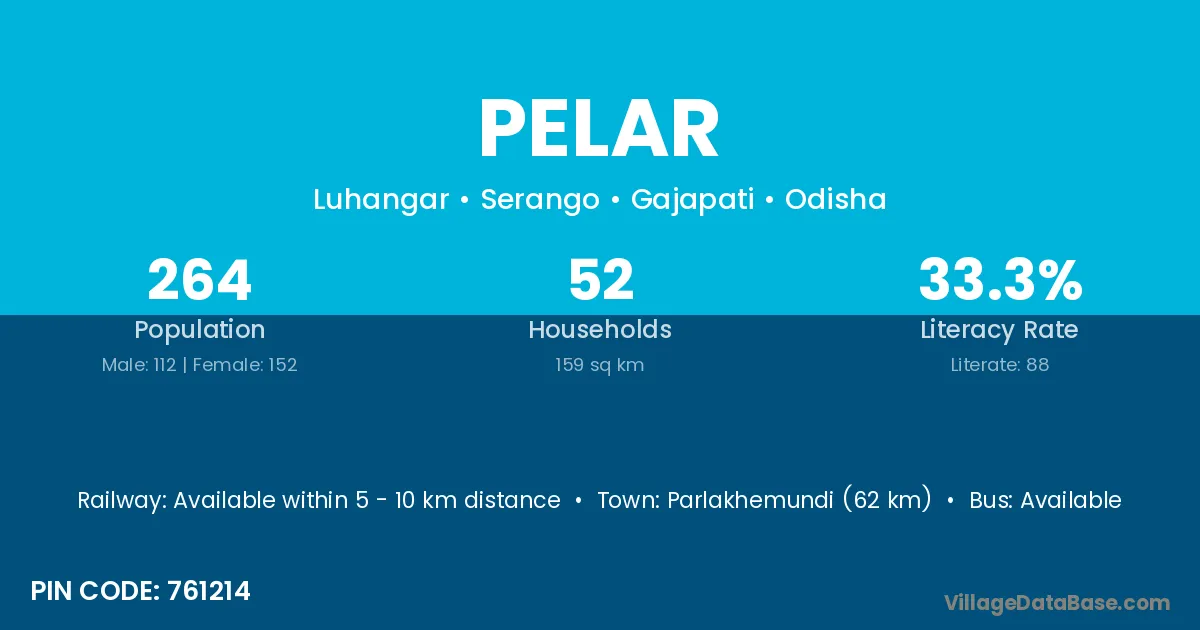 Parlakhemundi (62 km) is the nearest town to Pelar village for major economic activities and is located approximately 62 km away.
