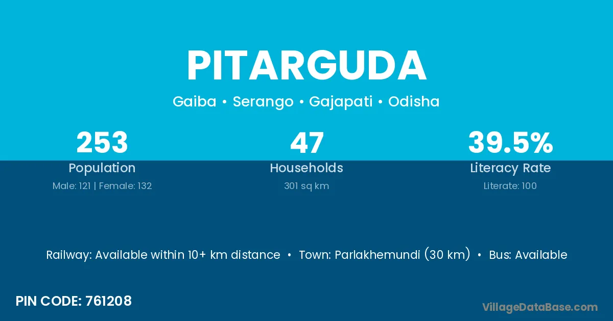 Parlakhemundi (30 km) is the nearest town to Pitarguda village for major economic activities and is located approximately 30 km away.