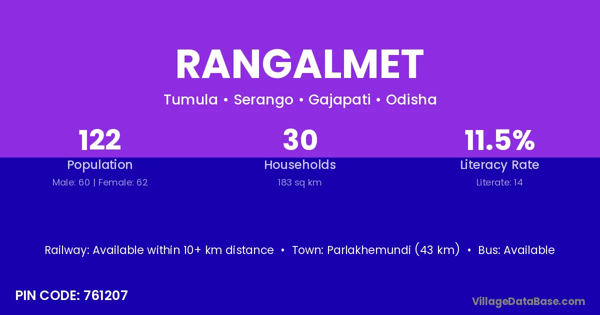 Parlakhemundi (43 km) is the nearest town to Rangalmet village for major economic activities and is located approximately 43 km away.