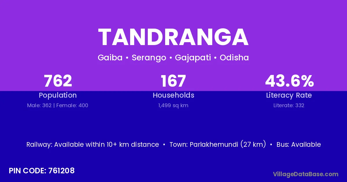 Parlakhemundi (27 km) is the nearest town to Tandranga village for major economic activities and is located approximately 27 km away.