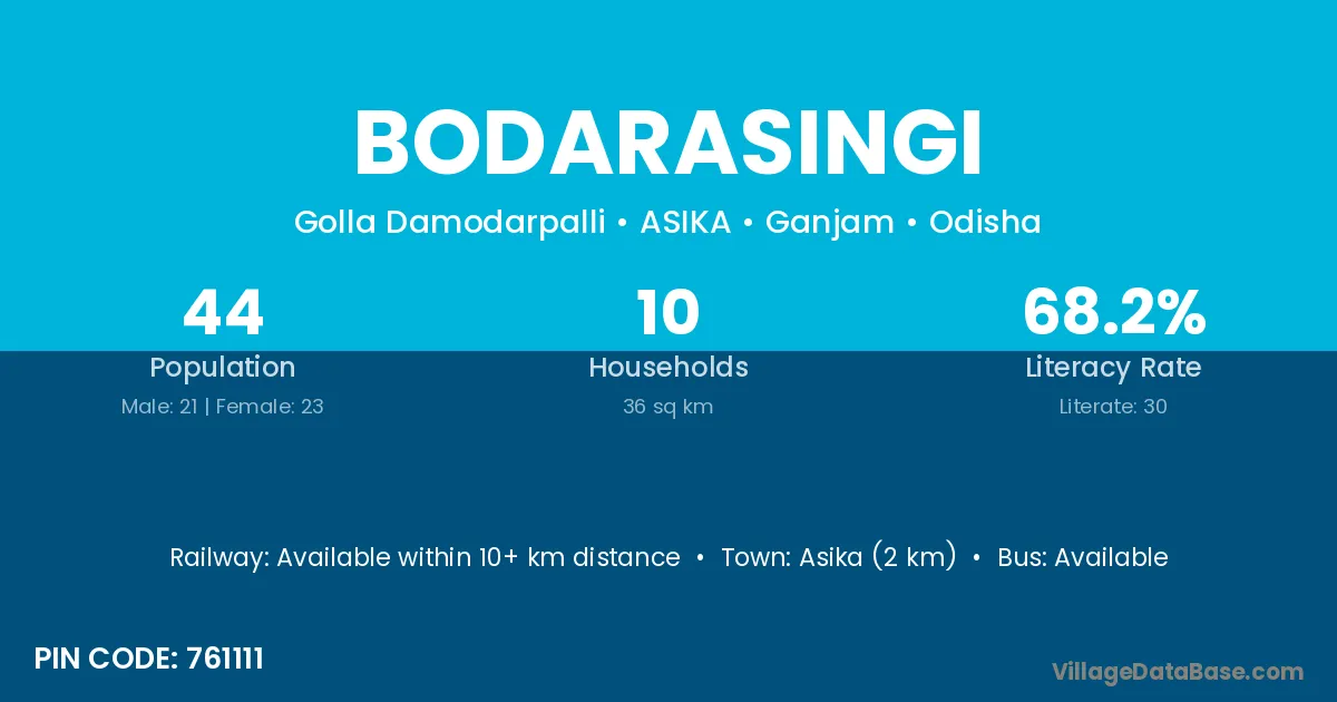 Asika (2 km) is the nearest town to Bodarasingi village for major economic activities and is located approximately 2 km away.