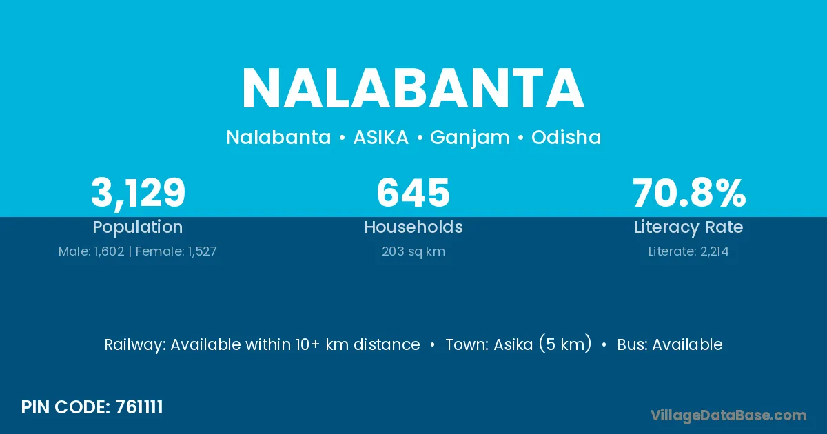 Asika (5 km) is the nearest town to Nalabanta village for major economic activities and is located approximately 5 km away.