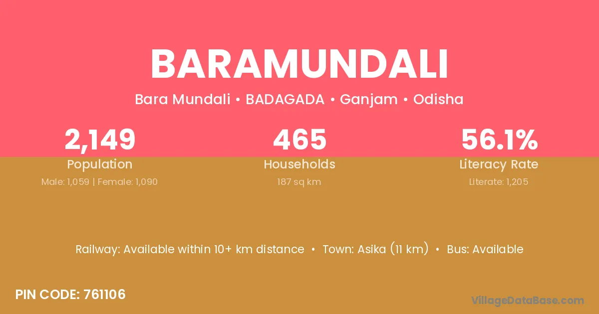 Asika (11 km) is the nearest town to Baramundali village for major economic activities and is located approximately 11 km away.