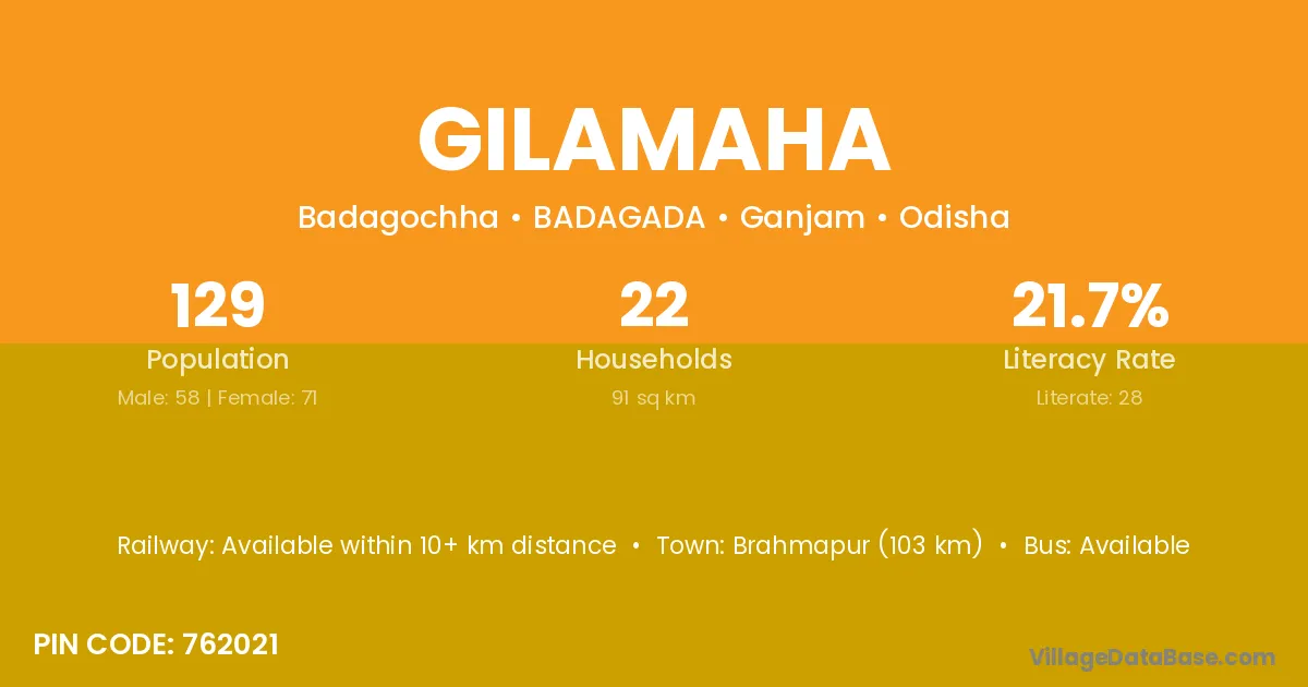 Brahmapur (103 km) is the nearest town to Gilamaha village for major economic activities and is located approximately 103 km away.