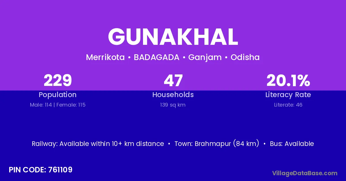 Gunakhal village has a total population of 229 people, of which 114 are males and 115 are females.