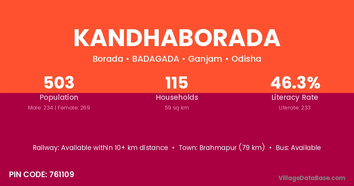 Kandhaborada village has a total population of 503 people, of which 234 are males and 269 are females.