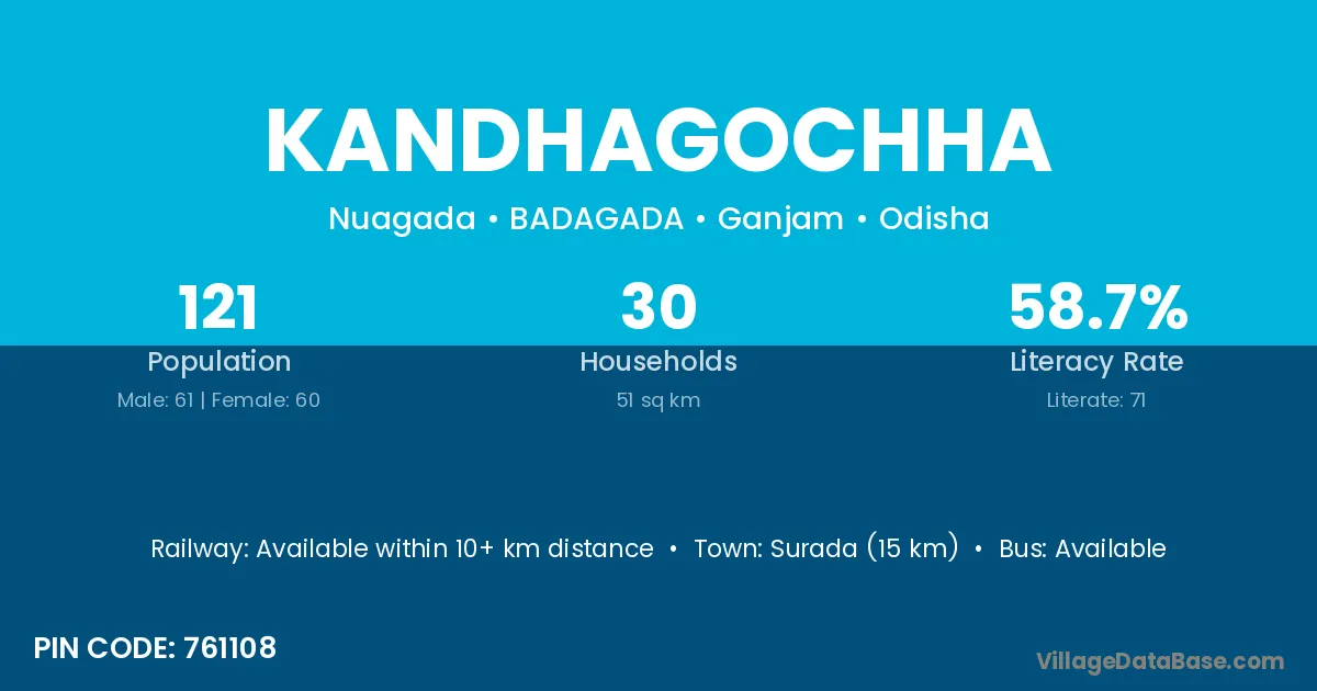 Kandhagochha village has a total population of 121 people, of which 61 are males and 60 are females.