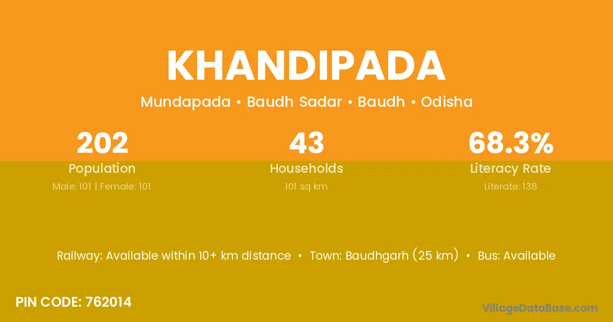 Asika (38 km) is the nearest town to Khandipada village for major economic activities and is located approximately 38 km away.