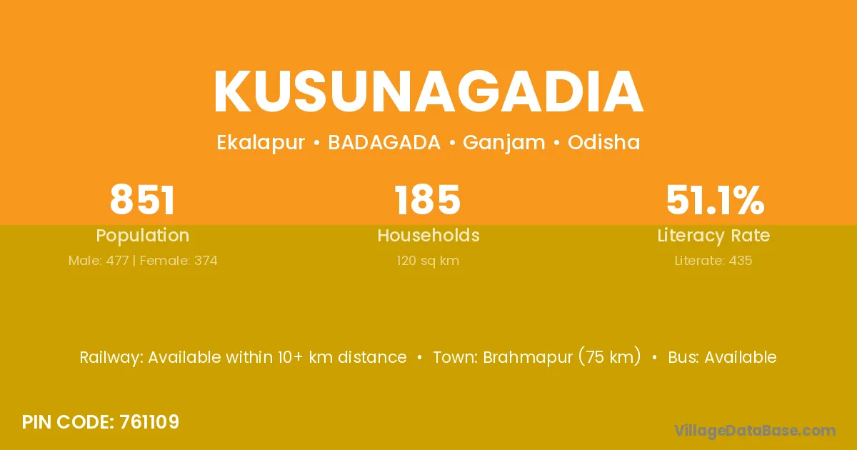Brahmapur (75 km) is the nearest town to Kusunagadia village for major economic activities and is located approximately 75 km away.
