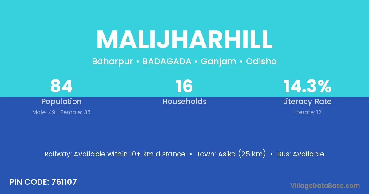 Asika (25 km) is the nearest town to Malijharhill village for major economic activities and is located approximately 25 km away.