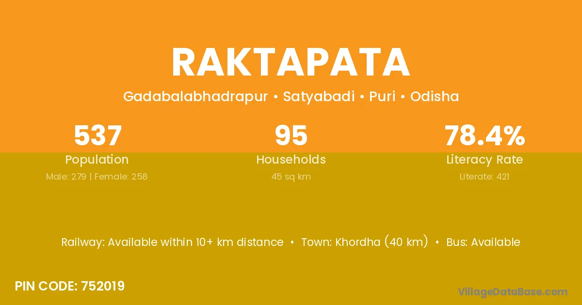 Asika (30 km) is the nearest town to Raktapata village for major economic activities and is located approximately 30 km away.