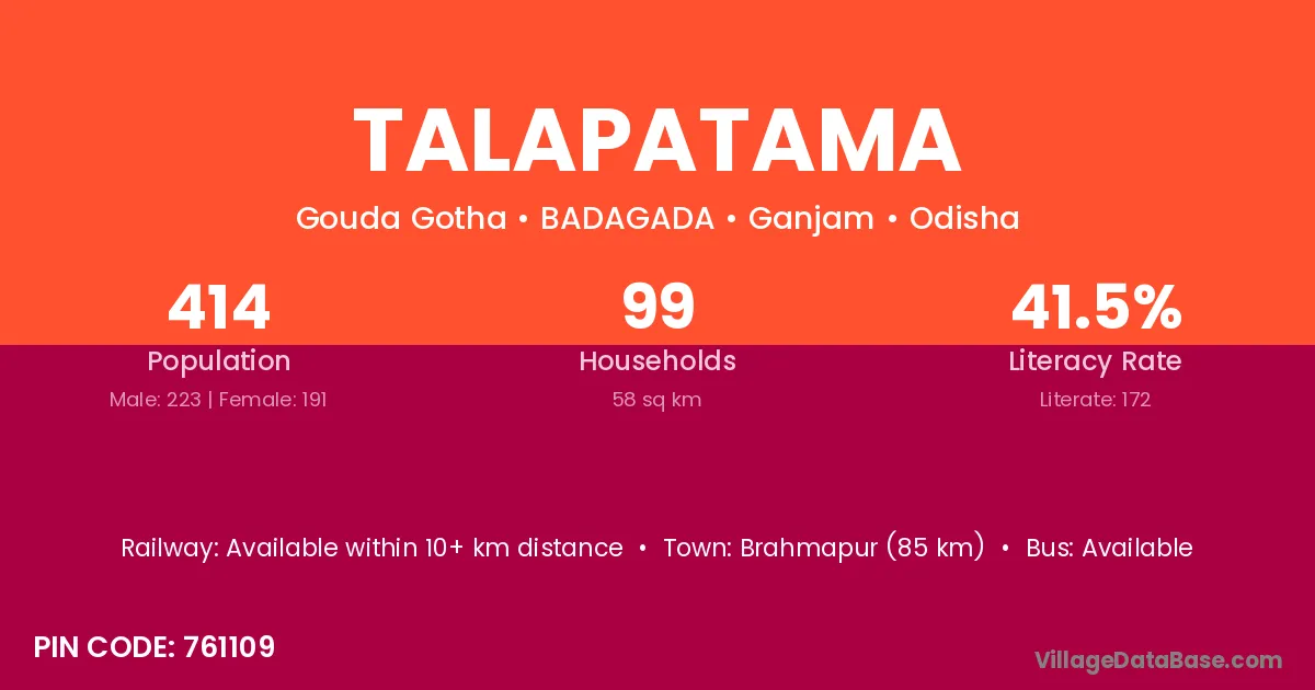 Talapatama village has a total population of 414 people, of which 223 are males and 191 are females.