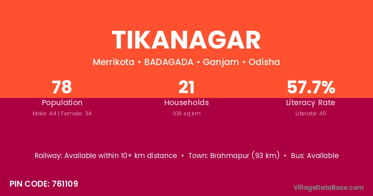 Tikanagar village has a total population of 78 people, of which 44 are males and 34 are females.