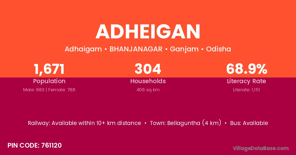 Bellaguntha (4 km) is the nearest town to Adheigan village for major economic activities and is located approximately 4 km away.