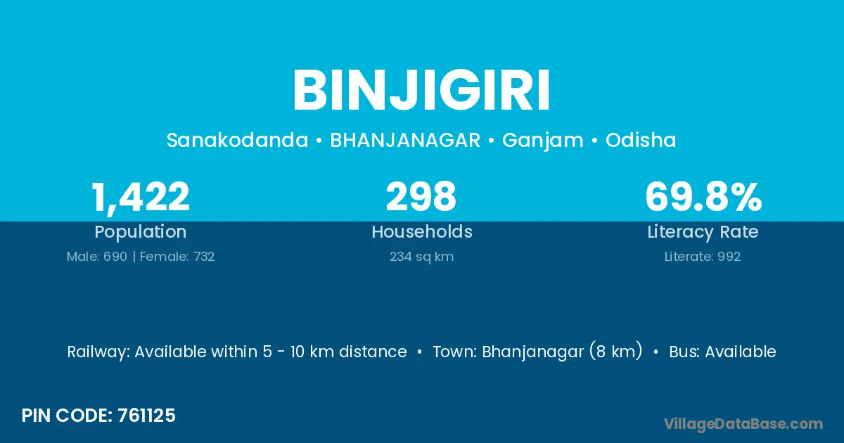 Bhanjanagar (8 km) is the nearest town to Binjigiri village for major economic activities and is located approximately 8 km away.