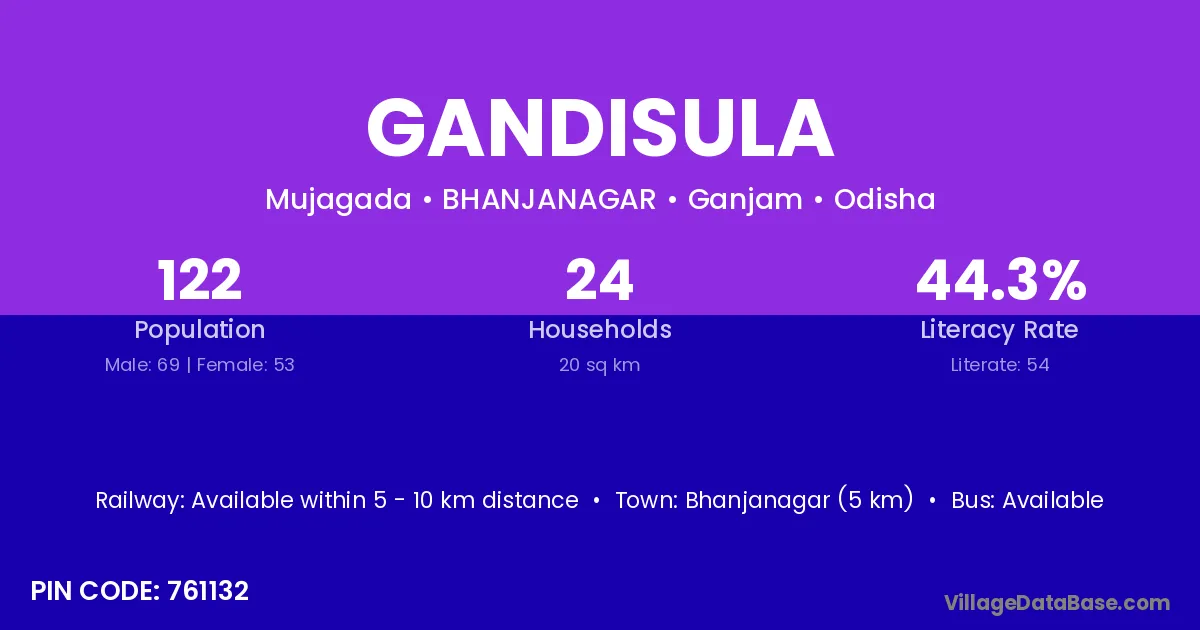 Gandisula village has a total population of 122 people, of which 69 are males and 53 are females.