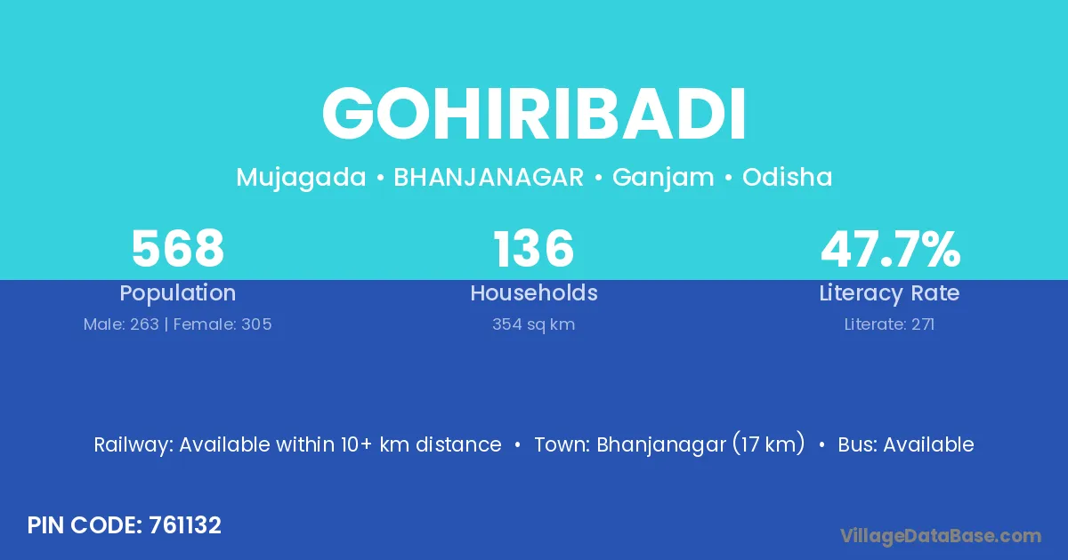 Bhanjanagar (17 km) is the nearest town to Gohiribadi village for major economic activities and is located approximately 17 km away.