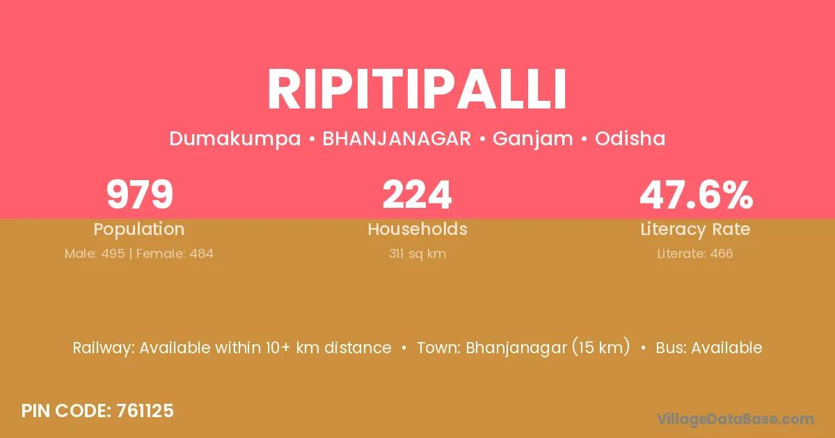 Bhanjanagar (15 km) is the nearest town to Ripitipalli village for major economic activities and is located approximately 15 km away.