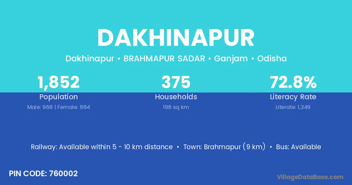 Brahmapur (9 km) is the nearest town to Dakhinapur village for major economic activities and is located approximately 9 km away.