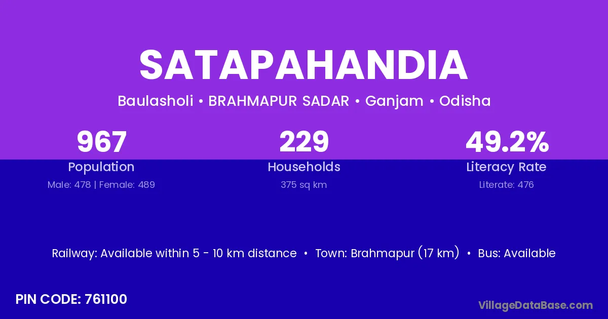 Brahmapur (17 km) is the nearest town to Satapahandia village for major economic activities and is located approximately 17 km away.