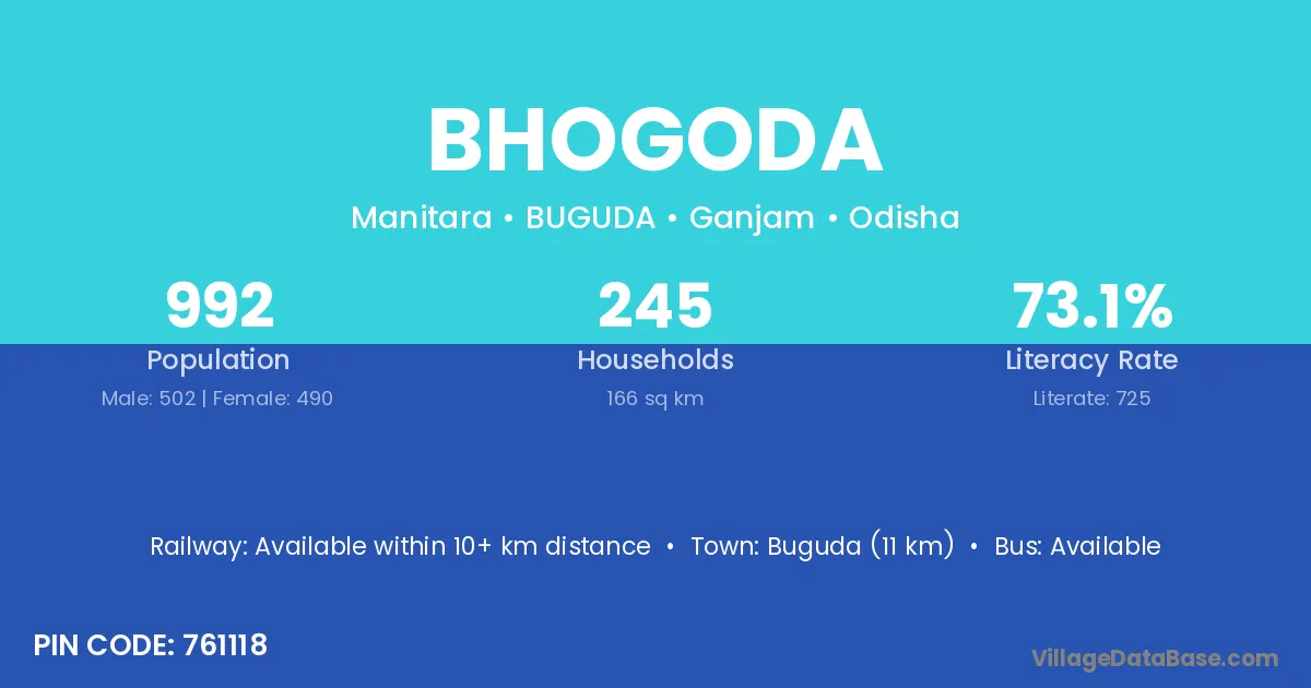 Buguda (11 km) is the nearest town to Bhogoda village for major economic activities and is located approximately 11 km away.