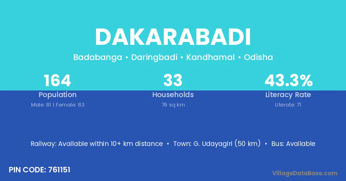 Buguda (8 km) is the nearest town to Dakarabadi village for major economic activities and is located approximately 8 km away.
