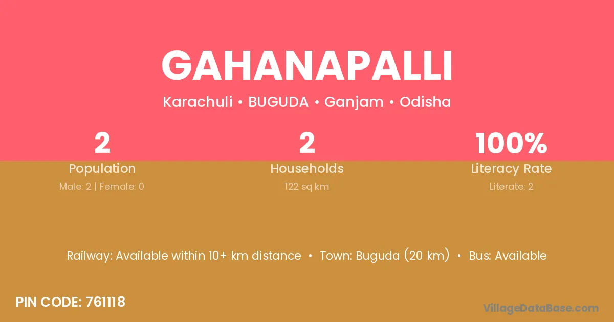 Buguda (20 km) is the nearest town to Gahanapalli village for major economic activities and is located approximately 20 km away.