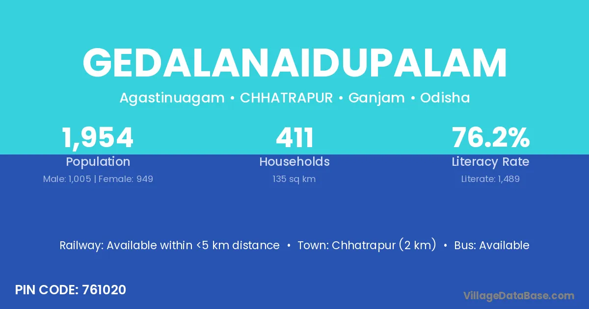 Chhatrapur (2 km) is the nearest town to Gedalanaidupalam village for major economic activities and is located approximately 2 km away.