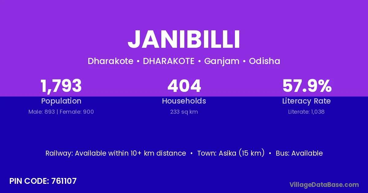 Janibilli village has a total population of 1,793 people, of which 893 are males and 900 are females.